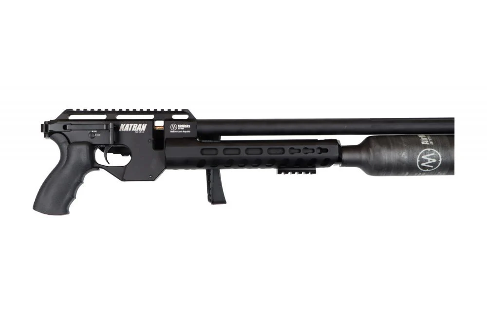 Lightweight and comfortable air rifle KATRAN has an ergonomic right-hand AR15 grip, a foldable stock with adjustable butt-pad and cheek-piece. The aluminium handguard has a 9 slot KeyMod for accessory mounting. Easy-cocking side lever comfortably situated near the trigger with a possibility to change right-left side. The trigger has a 2-stage adjustment. KATRAN is also equipped with an anti-double feed system.